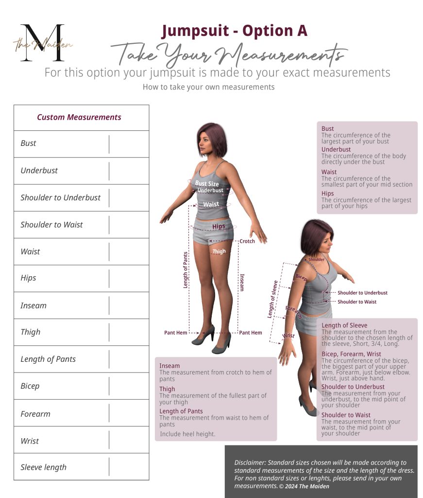 At The Maiden, we pride ourselves on crafting dresses tailored precisely to your unique measurements, ensuring a flawless fit that complements your beauty. Our sizing process offers two convenient options: you may either provide your own measurements or select a standard size from our comprehensive size guide. Rest assured, your dress will be expertly crafted to reflect your specified measurements or chosen size with meticulous attention to detail.