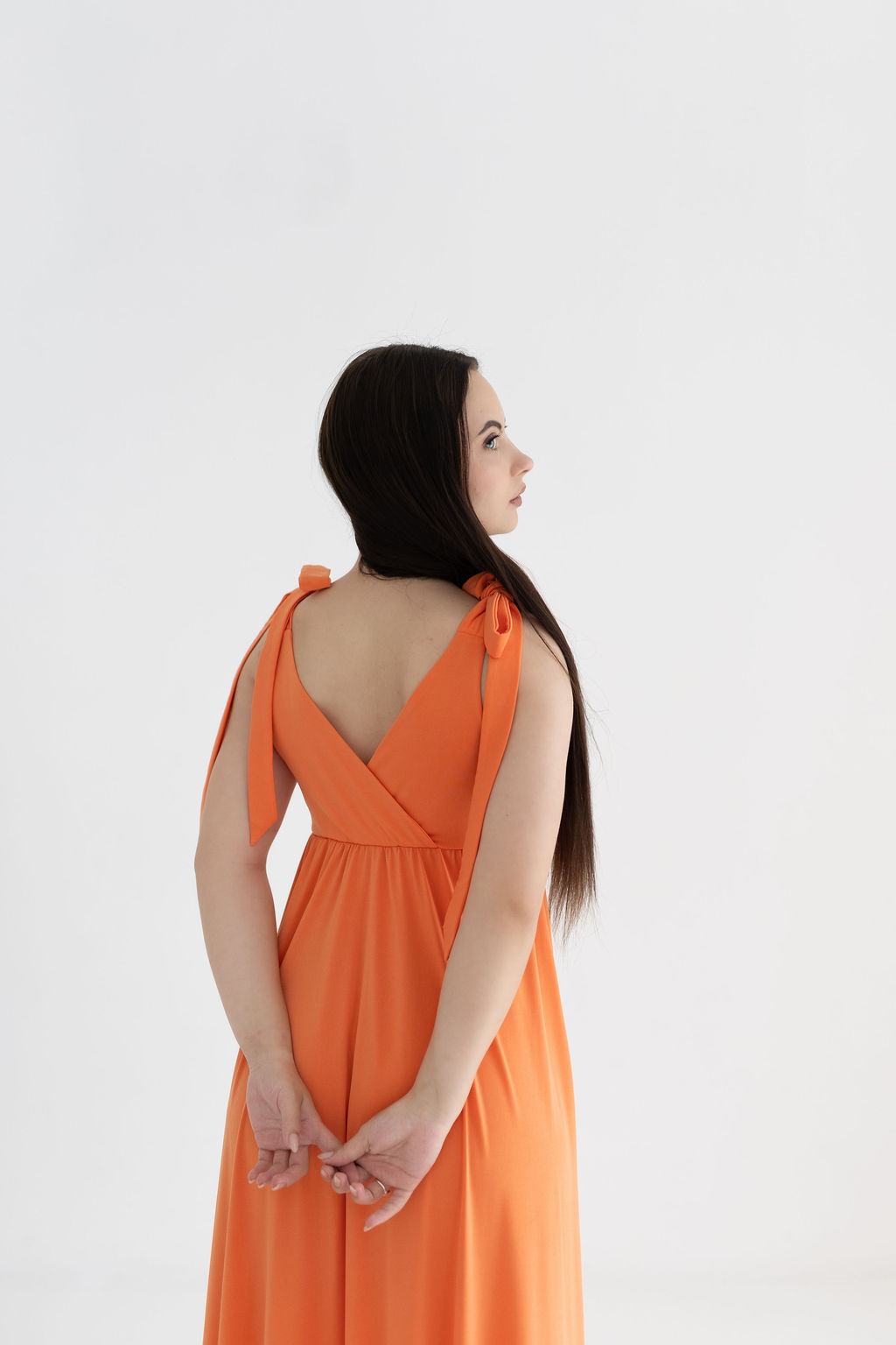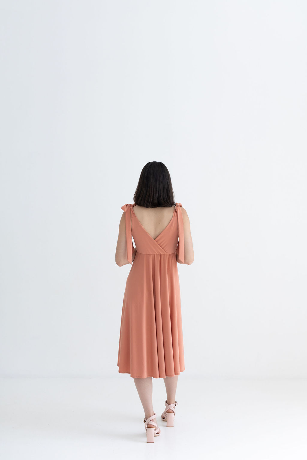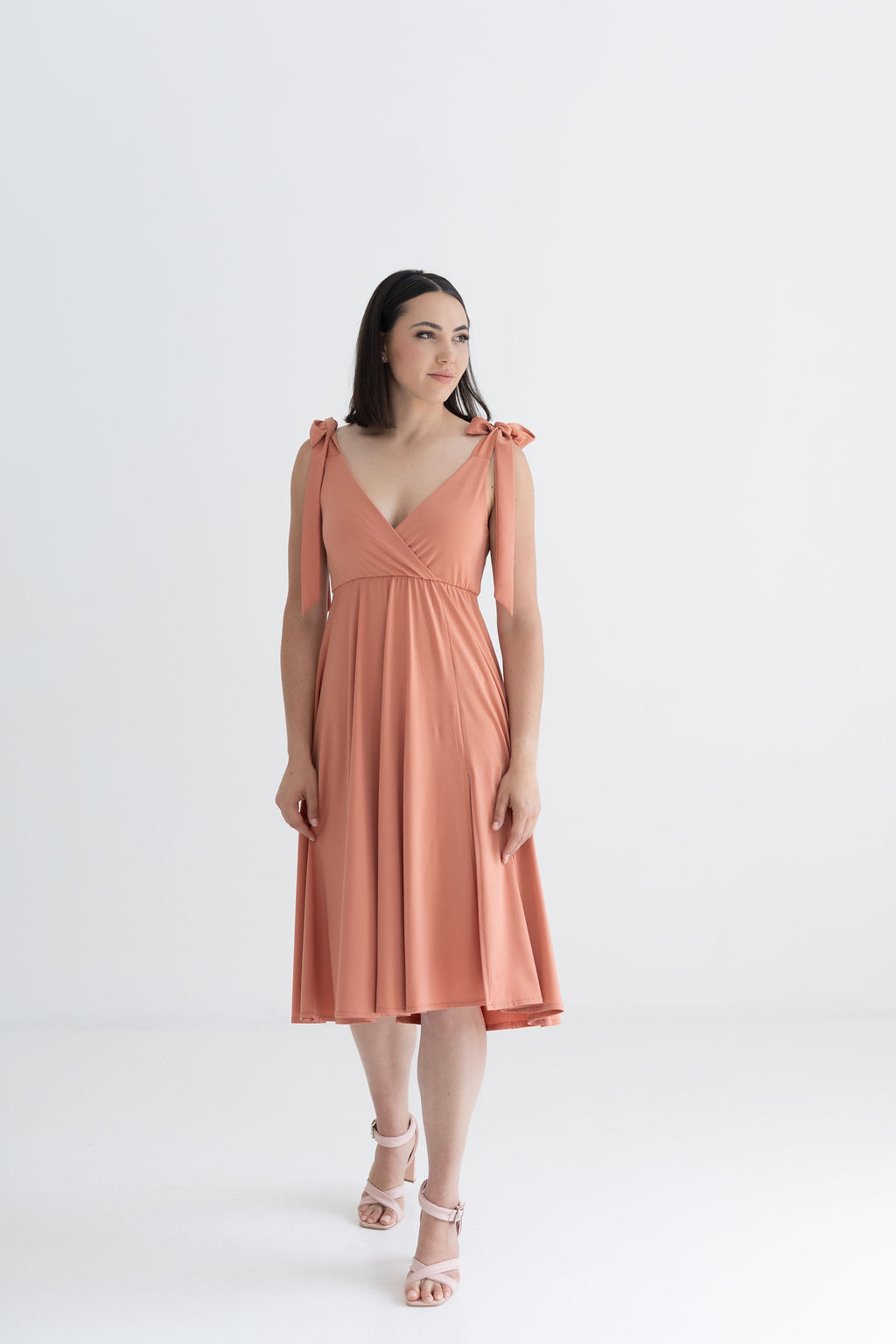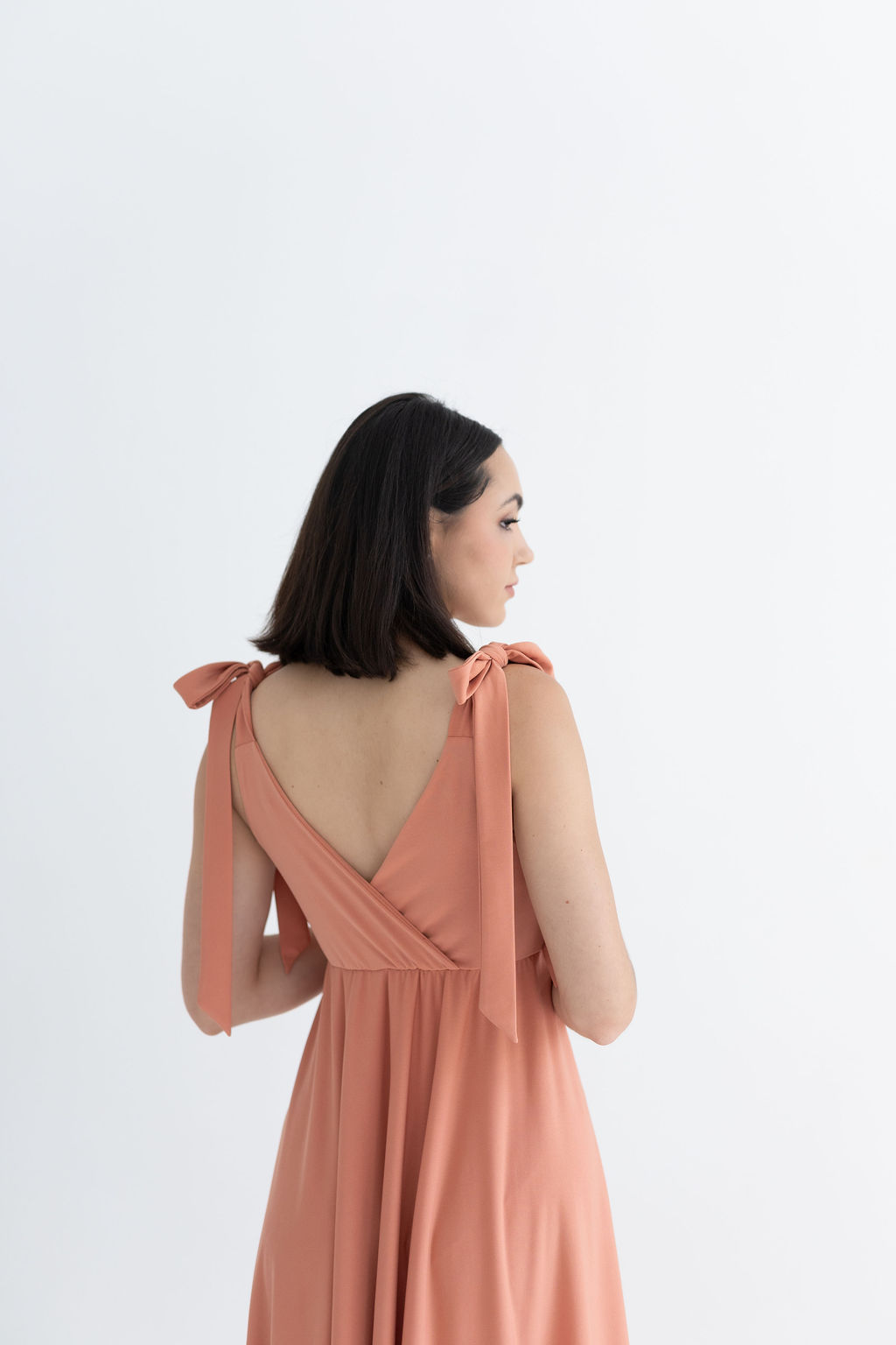 A stunning cross-over v-neck dress with bow detailing on the shoulders