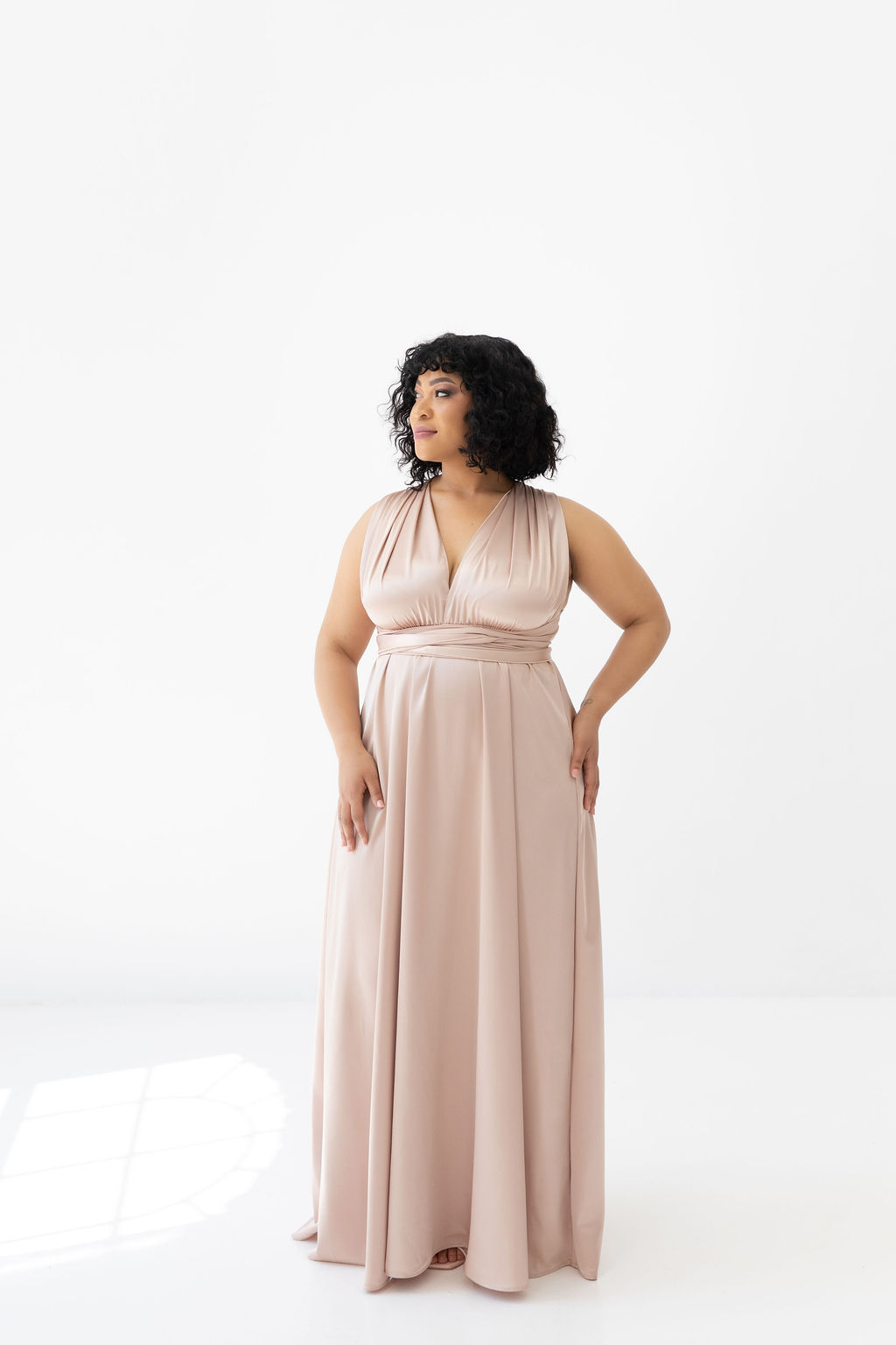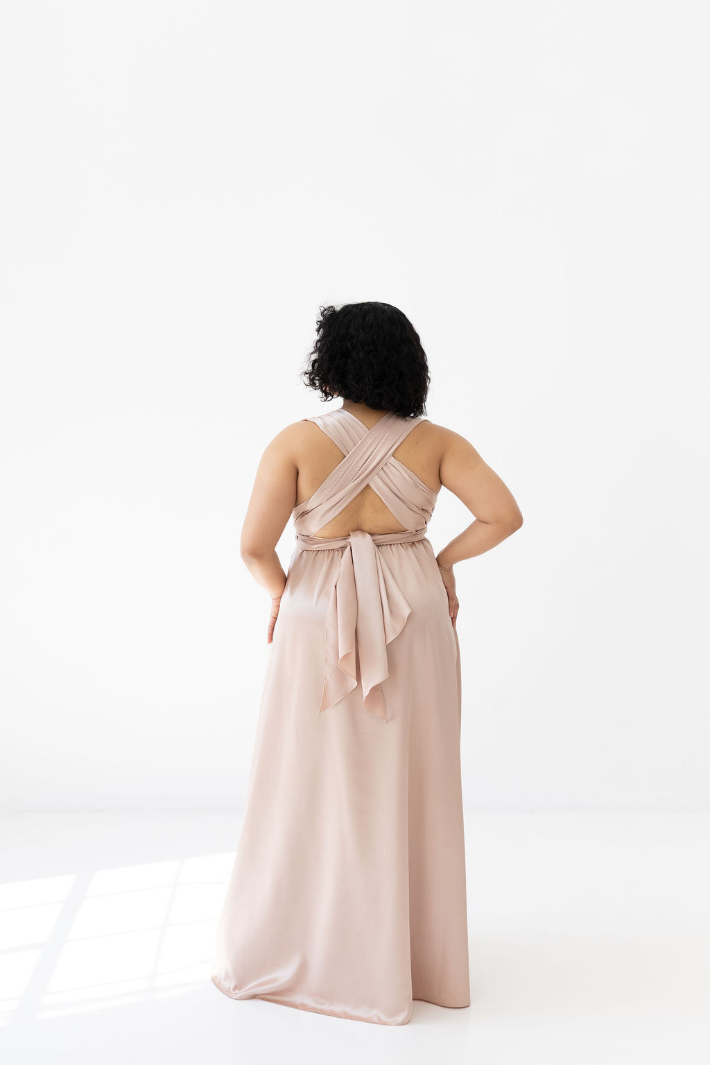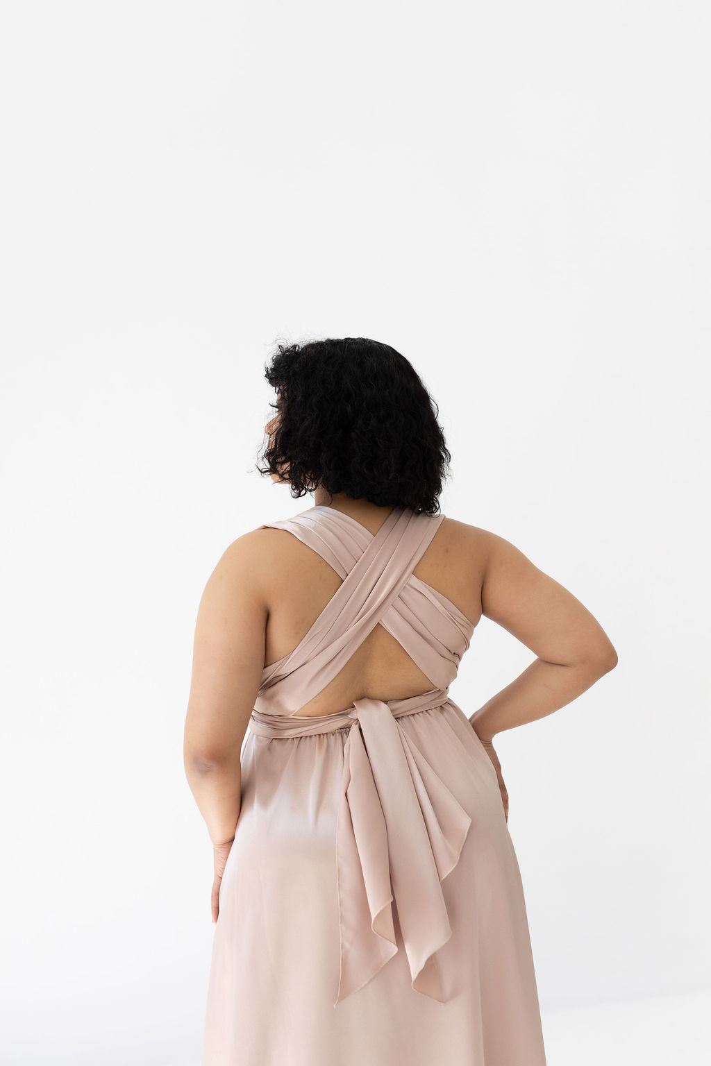 The Carmen Dress now in Satin, also known as Infinity, Convertible, Wrap or Multiway dress is a timeless and elegant dress. Fold the bands in different ways to achieve unique looks.